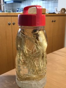 そして何より有名なのは大根島が国内有数の高麗人参(こちらではオタネニンジンというそうです)の産地であることと、今の季節漢方薬の主役である高麗人参の乾燥されたものでなく生のものが手に入るということでした。健康寿命を延ばす食事ということでかねてより薬膳料理の講習会も受けていましたが、手軽に漢方の主役が取れるということで高麗人参酒を造ることにしました。半年の時間は待たなければならないようですが、じっくりと成分が抽出された高麗人参酒を梅酒などとブレンドしてセレスコート啓明の皆さんにお飲みいただきたいと思っています。