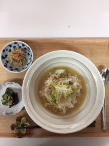 昼食はアボガドと明太とろろ丼で、長ねぎをしっかり焼いてスープにした香ばしさの中にさっぱり感のあるものです。昼食時には啓明家庭医療クリニックのドクターやスタッフも入居者の皆さんと家族としてご一緒に食事をさせて
